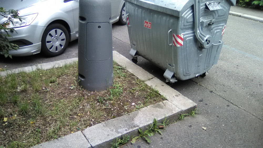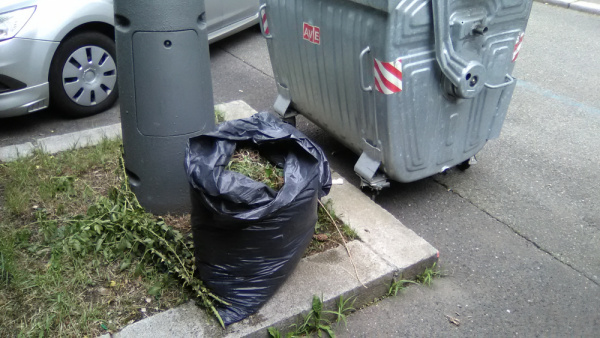 Cerna skladka za kontejnerem(cerne plne pytle) pred domem Kunešova 10