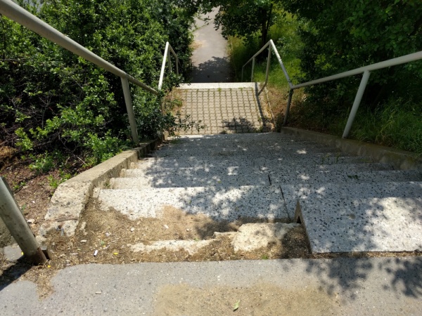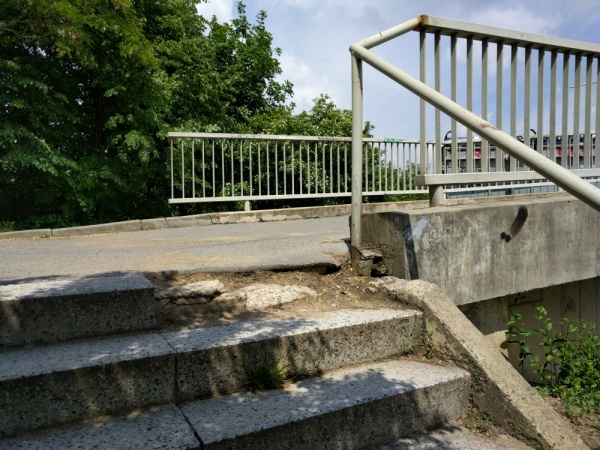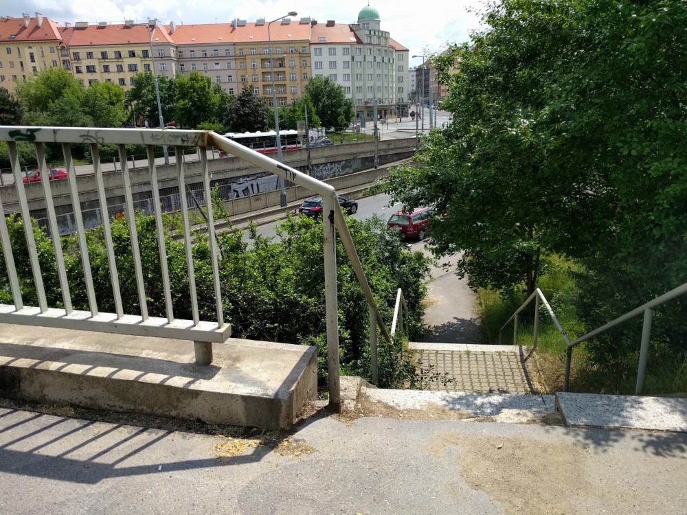 rozbitý schod na schodišti vedoucí z Ohrady na most na Vítkov (může být nebezpečné)