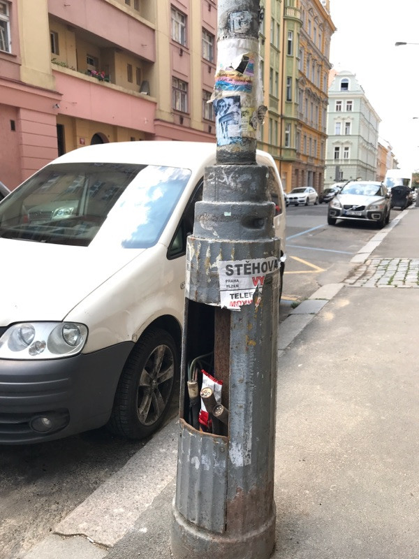 Chybějící kryt na sloupu veřejného osvětlení. Nebezpečí úrazu elektrickým proudem.