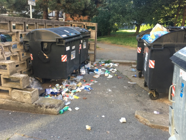 děkujeme za Váš podnět. Udržování čistoty okolo kontejnerů na komunální odpad je záležitost majitele domu či SVJ. Nicméně na místo se zajedeme podívat.