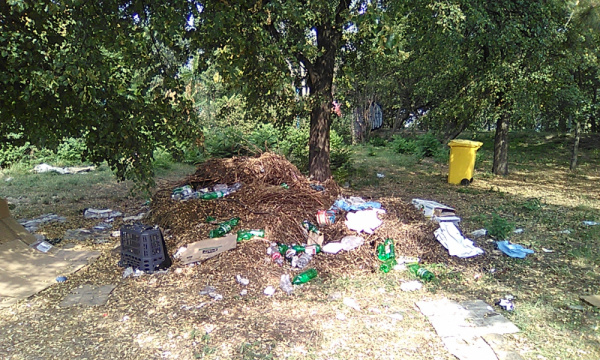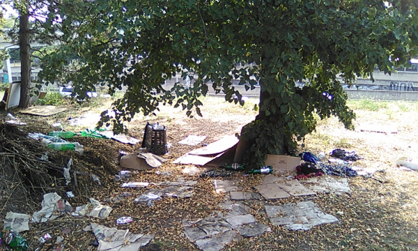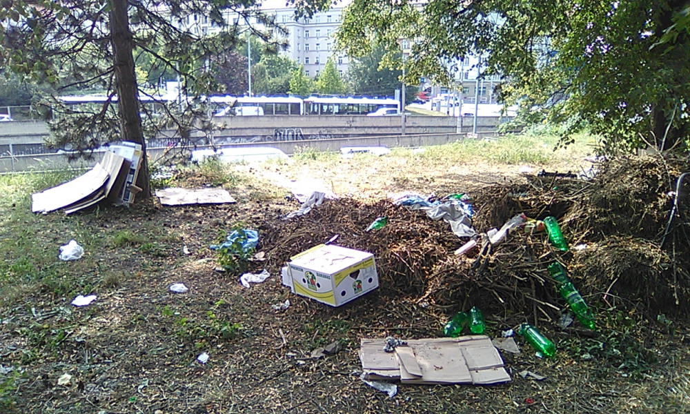Kartóny, nepořádek v širším okolí od našich bezdomovců. Zřejmě se sem přesunuli ze zbouraných garáží na Krejcárku.