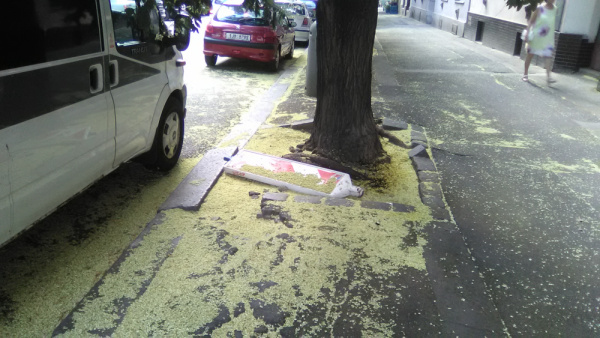 Dopravní značka (deska se šikmými pruhy) u stromu před barem Čekárna. Už je tam asi týden.