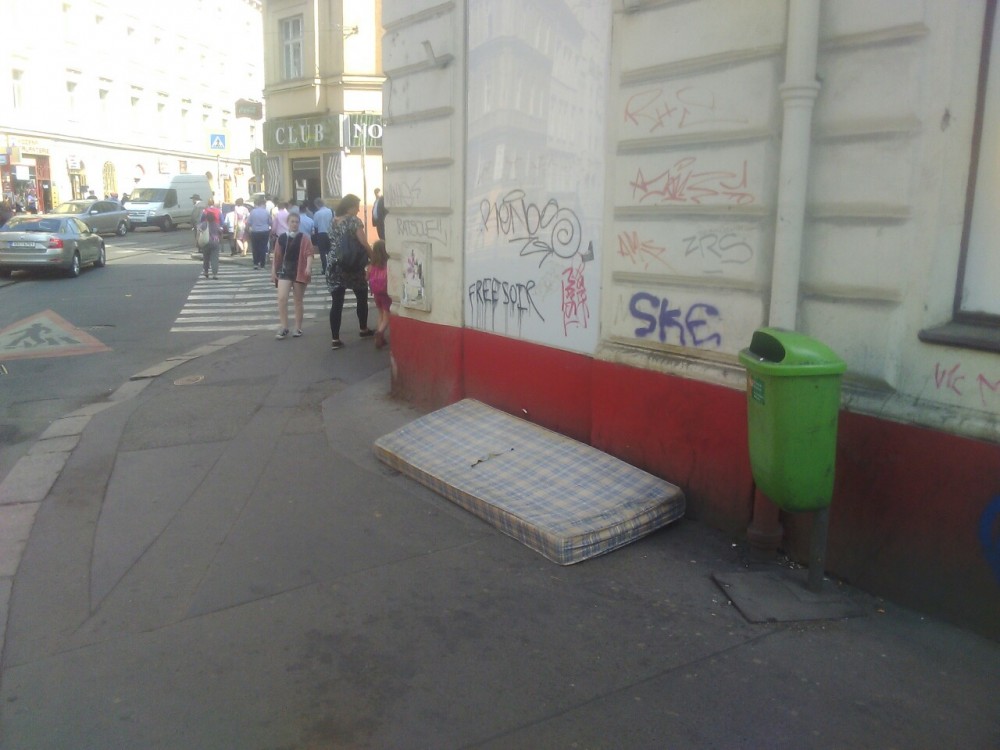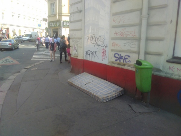 Matrace opřená o dům.