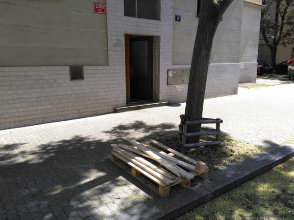 Od včerejška pohozená paleta, trčí z ní šrouby.....