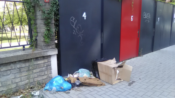 Po popelnicich u klecoveho stani v ulici Za žižkovskou vozovnou zustal neporadek na zemi.
