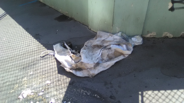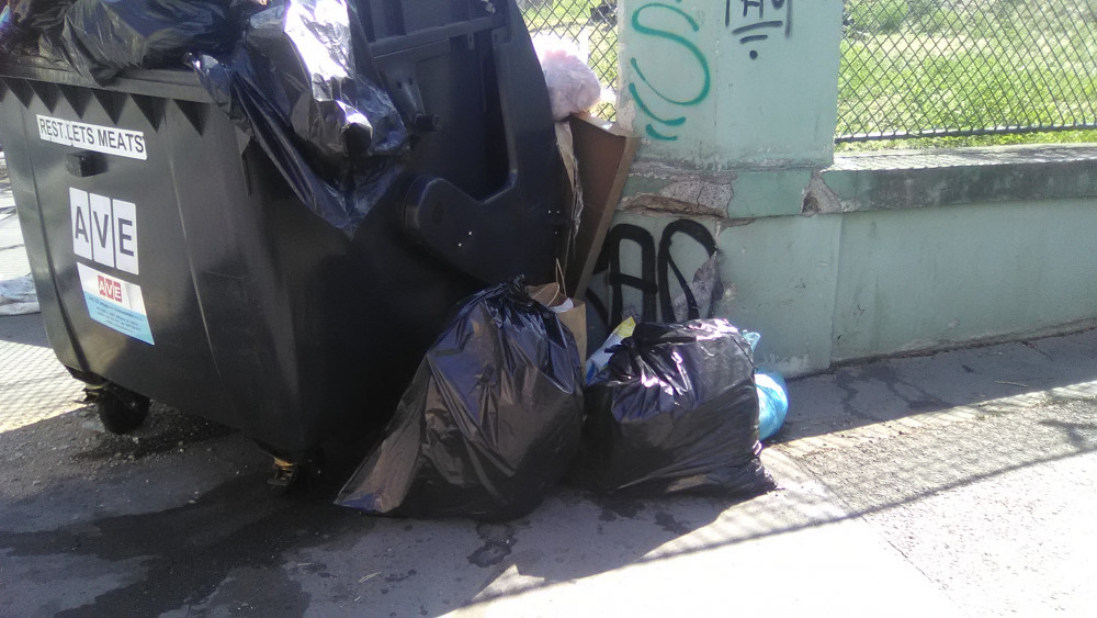 Přeplněná popelnice na rohu Jičínská a Slezska, vedle leží ještě něco jako staré maso v pytly