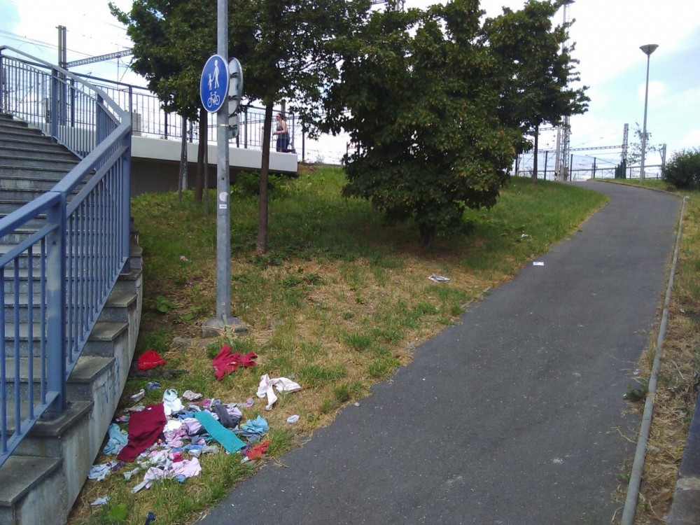 Dobrý den, v parčíku na rohu ulic Příběnická a Seifertova (před vstupem do podchodu pod tratí) je po trávníku roztahaná velká hromada oblečení plus běžné odpadky. Pod schodištěm je pelech bezdomovce plný kartonů a hadrů. Na trávníku se válí neshrabaná posekaná tráva plus kelímky, plechovky a další odpad. Metaři je to místo netknuté již několik dnů. Děkuji za zařízení úklidu.