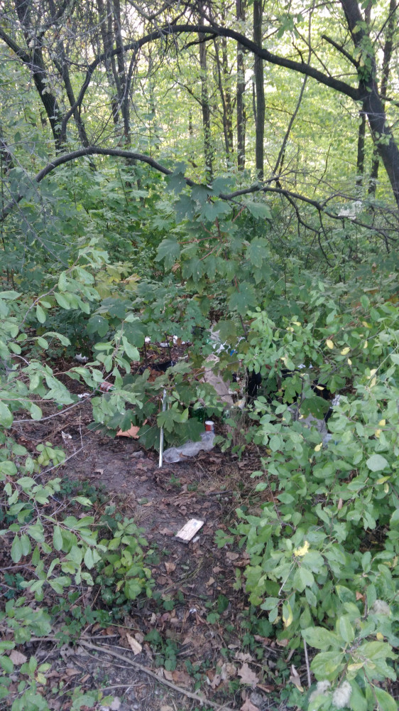 Černá skládka v lese. Jedná se o skládku naproti nocležně bezdomovců, u lampy č. 302146. Většinou se zde nachází plastový odpad jako PET lahve, polystyrenové obaly od jídel apod. Pod samotným silničním mostem směrem k tramvajové trati je také spousta odpadků.