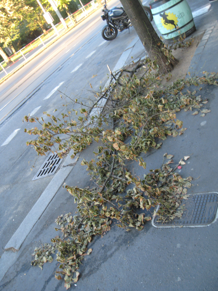 Ulomená usychající větev (po větrné smršti v ne 23. 9.). Prosím o úklid větve a případné šetrné (zahradnické) oříznutí cca 0,5 m zbylého trčícího pahýlu po větvi ve výšce asi 3 m ve větvích stromu.