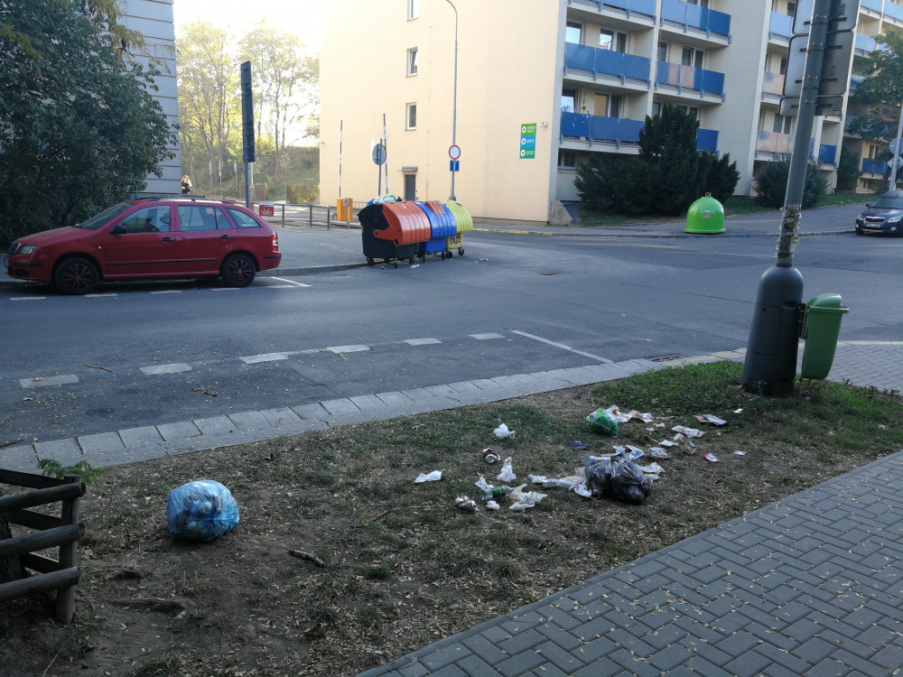 Opětovně rozházené / rozfoukane odpadky z nedalekých kontejneru