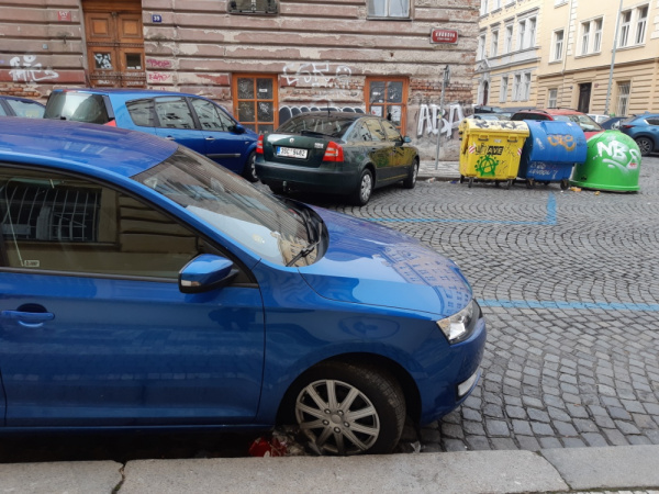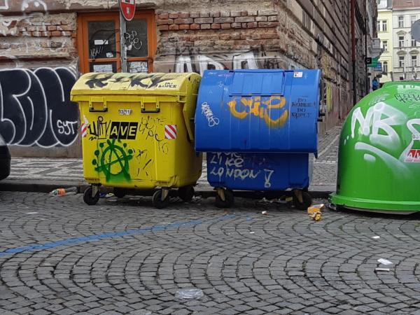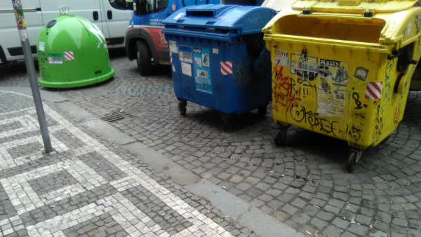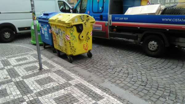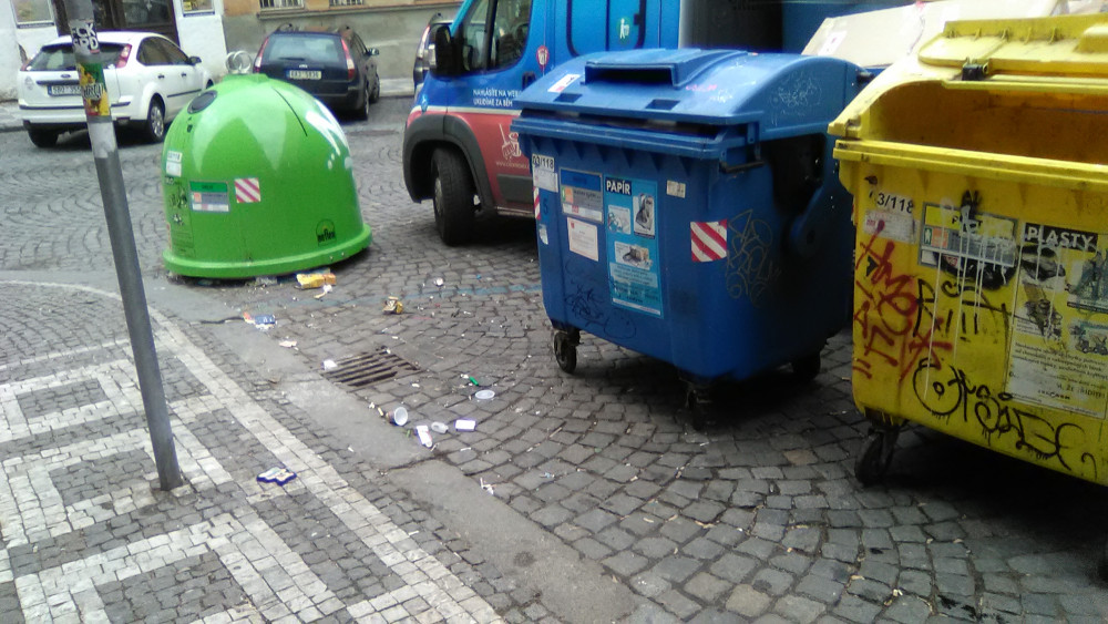 Nepořádek kolem kontejnerů. plast rozfoukane po celé Krasove ulici.
