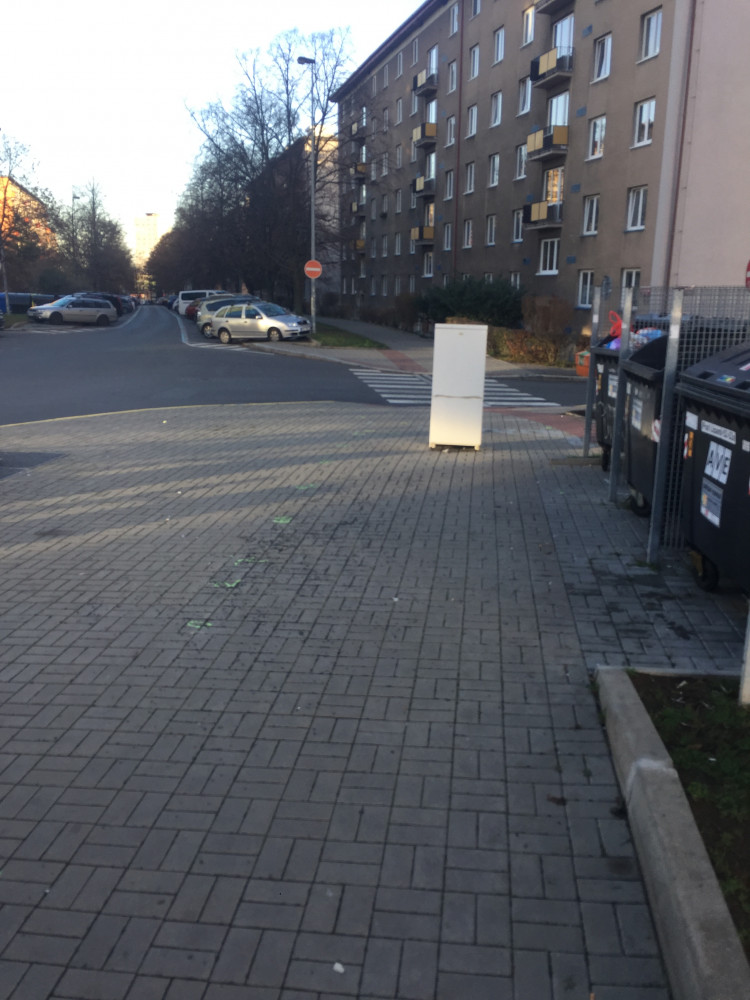 Nějaký z obyvatel domu na adrese Pod Lipami 52a usoudil, že bude dobrý nápad nechat uprostřed chodníku starou lednici. Stojí tu od nedělního večera a překáží chodcům. Děkuji!