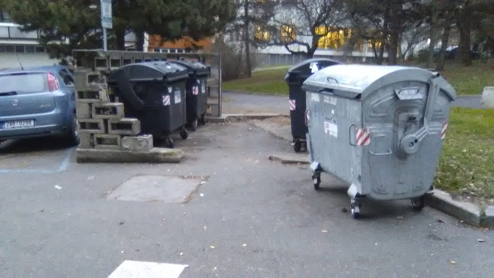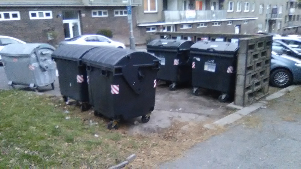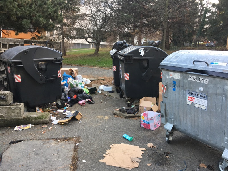 Takto vypadalo okoli popelnic minutu po vyvezeni. Nevim, zda v tom nahodou pani popelari nemaji nejaky system, kdo vi. Kazdopadne takto by to vypadat nemelo.