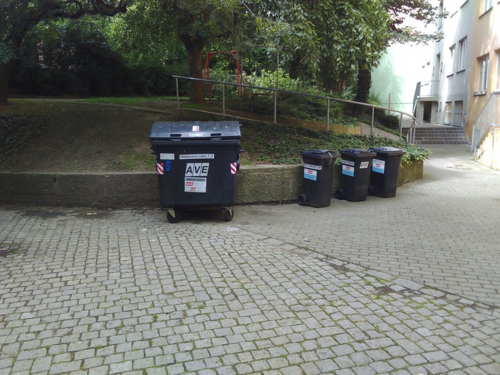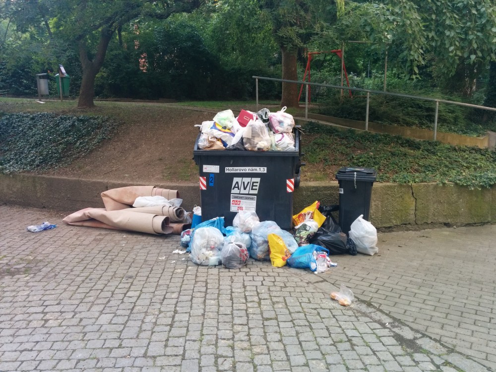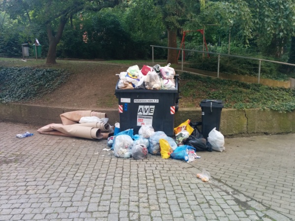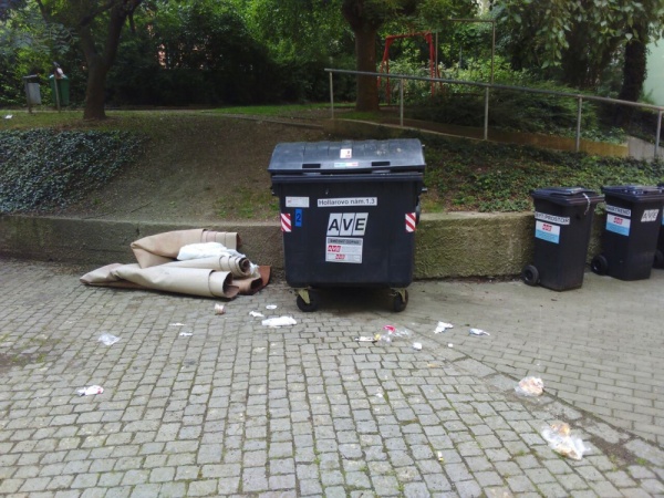 Nepořádek kolem kontejneru ve vnitrobloku Soběslavská