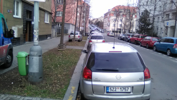 papiry a dalsi neporadek na hornim konci Jeseniovy ulice v zeleni, oba bloky u koleji VSE