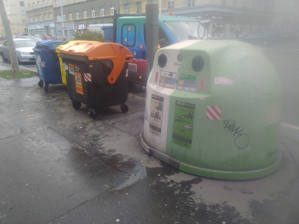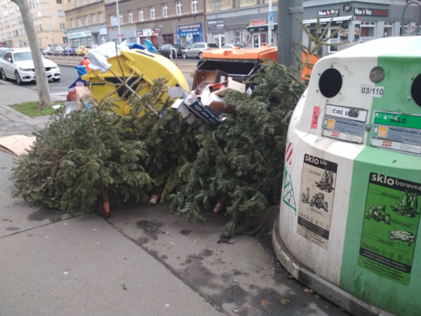 Stromky a nepořádek u kontejneru na tříděný odpad