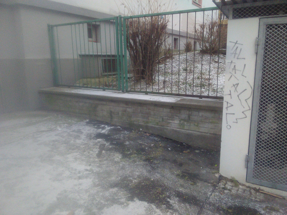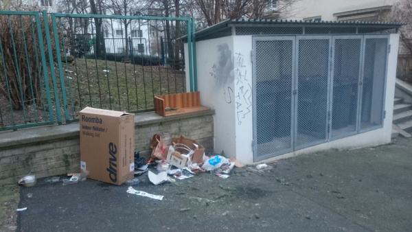Baranova 19 nepořádek kolem popelnicového přístřešku