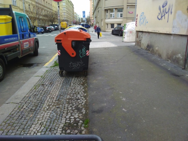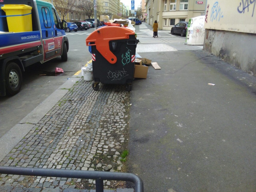Přemyslovská 25. Proti Všeobecné pojišťovně kartony okolo popelnic.