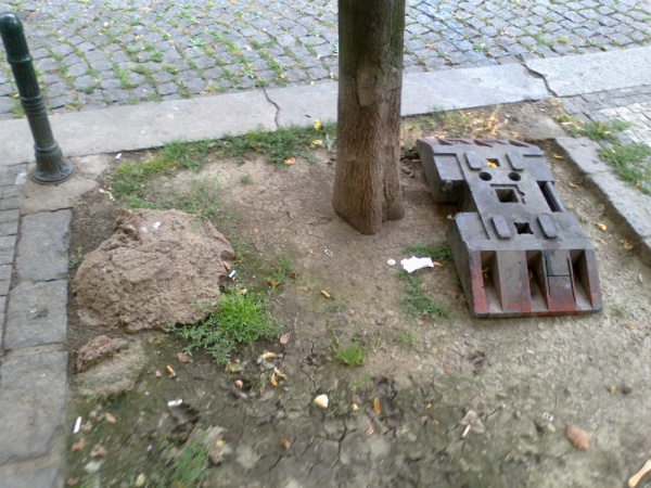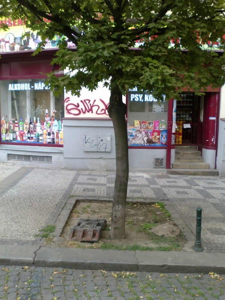 Úpatí stromu: kupka betonu a zapomenutý podstavec.