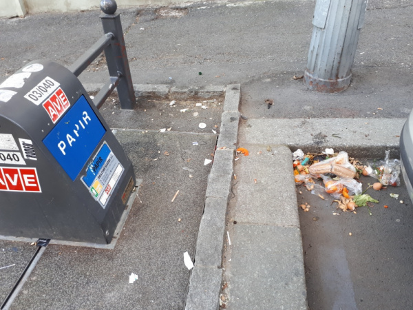 Rozházený směsný odpad v prostoru kontejnerů na tříděný.
