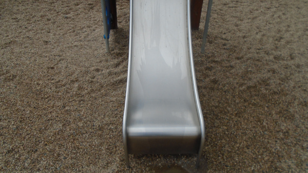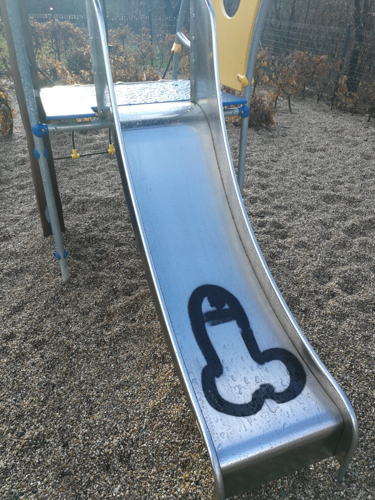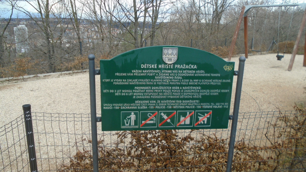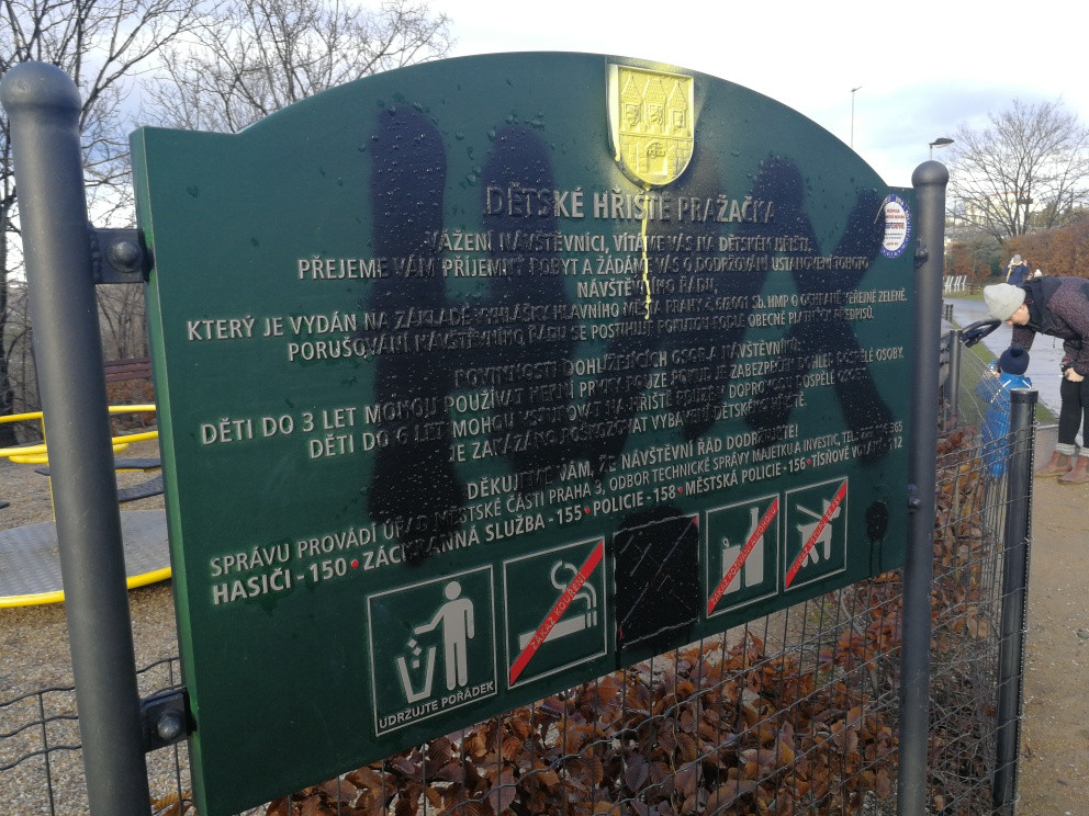 Pocmarana slkluzavka a cedule na dětském hristi prazacka.