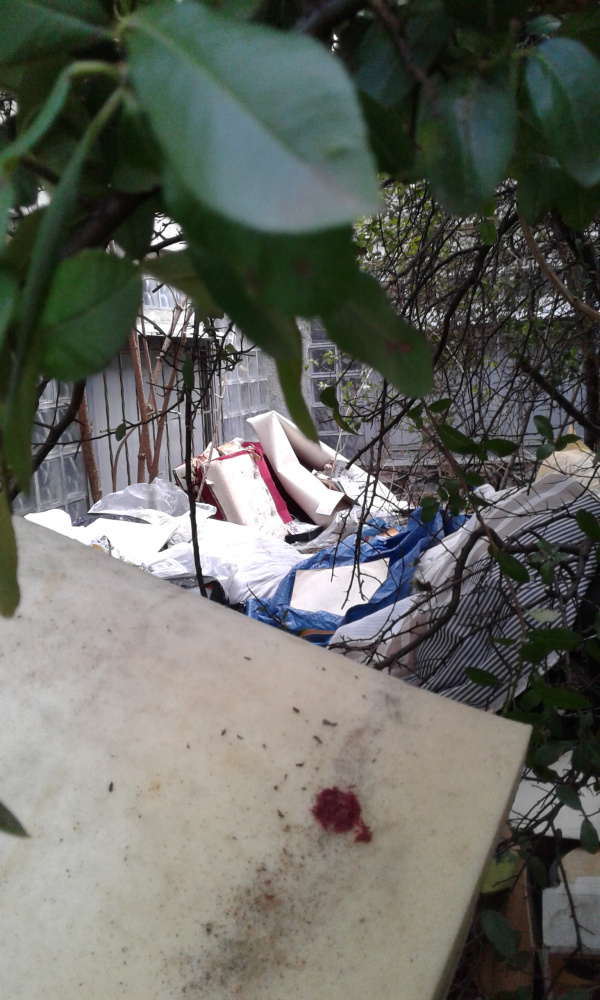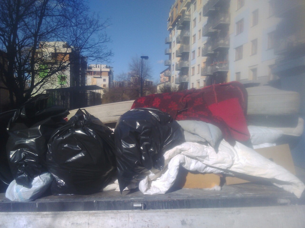 Úklid rozsáhlého bezdomoveckého brlohu.