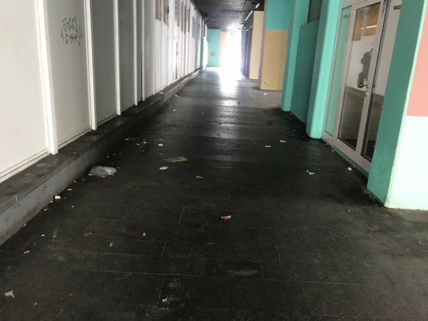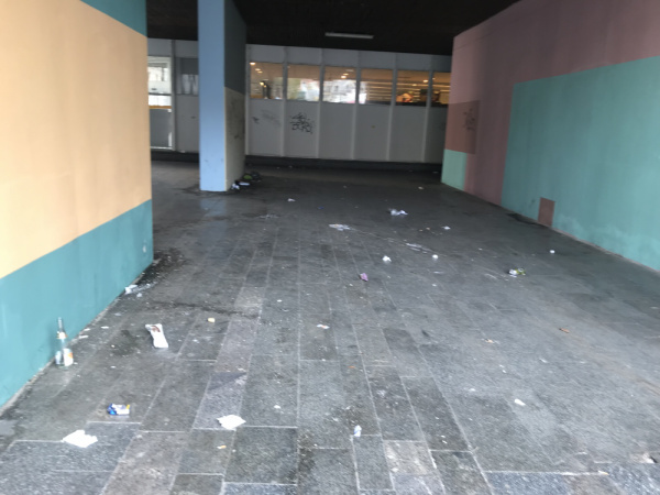 Nepořádek, odpadky v podloubich za a mezi vchody Kubelikova 60 - 66.