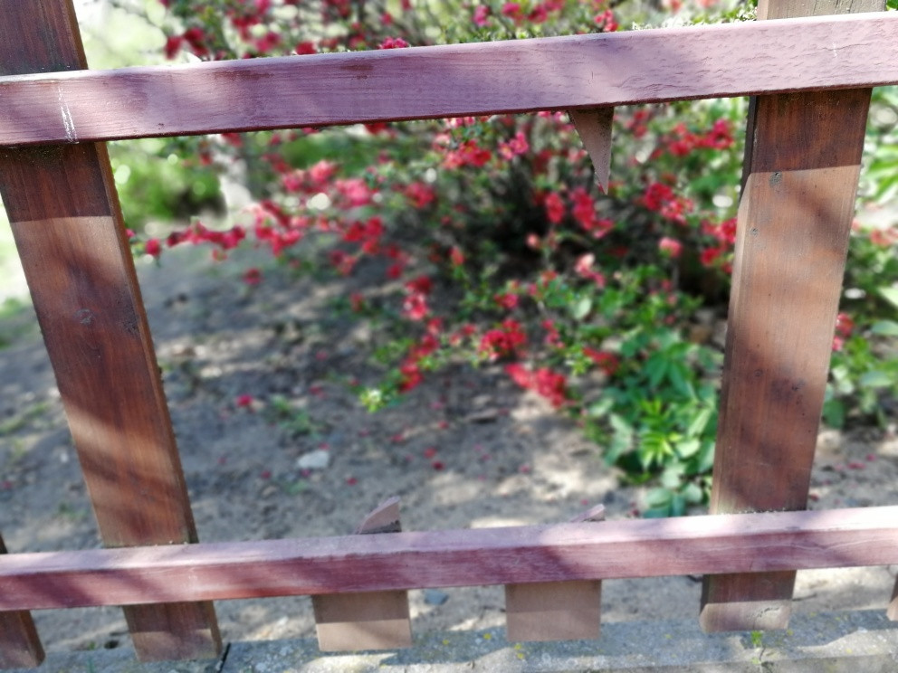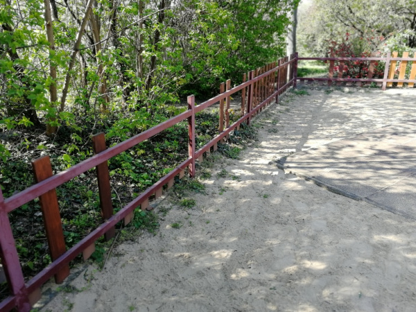 Rozbitý plot na dětském hřišti. Leckde koukají ostré hrany.
