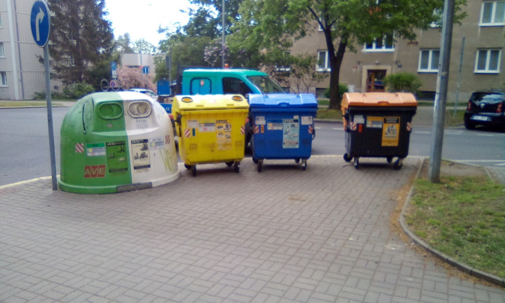 Velká (dvojitá) matrace u kontejnerů na tříděný odpad.