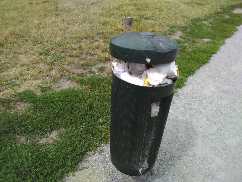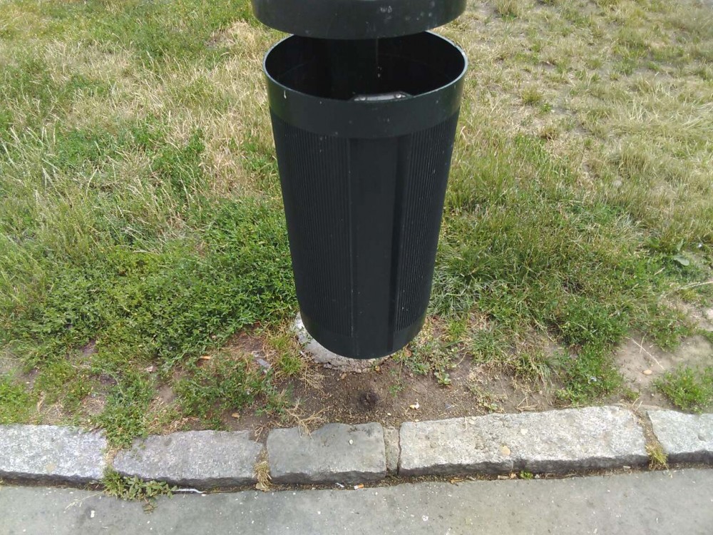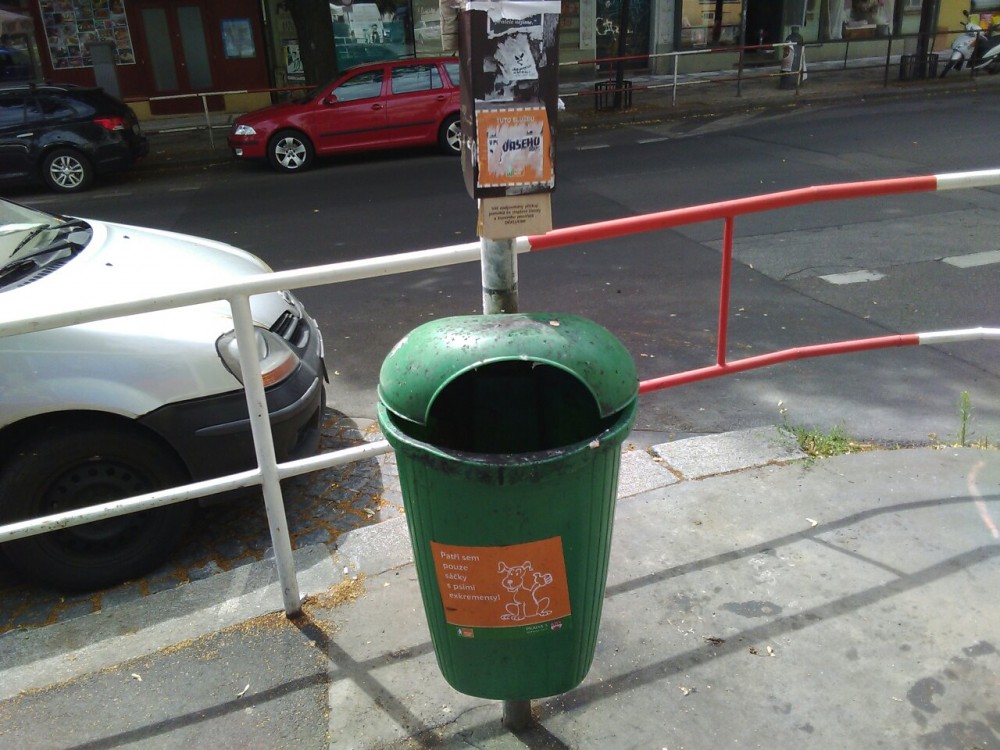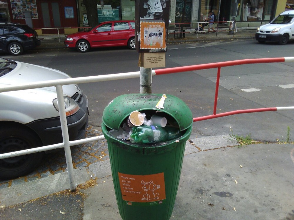 Pravidelná kontrola košů na Jiřího z Poděbrad. Koše všechny plné.