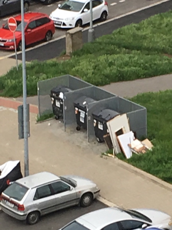 Prosim o uklid u kontejneru. Nekdo tady opet nechal nejspis rozlozeny stary nabytek