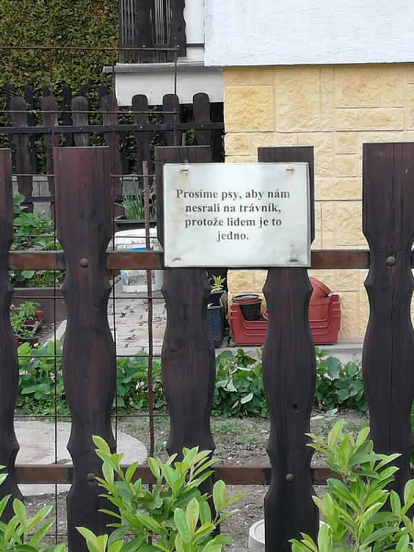 Muzete mi vysvetlit smysl teto cedule? Jak to tam muze nekdo nechat? Je vulgarni! Vzdyt ani ten pes si to nemuze precist. Prosim o provereni, pripadne o odstraneni nevhodne cedule/papiru.