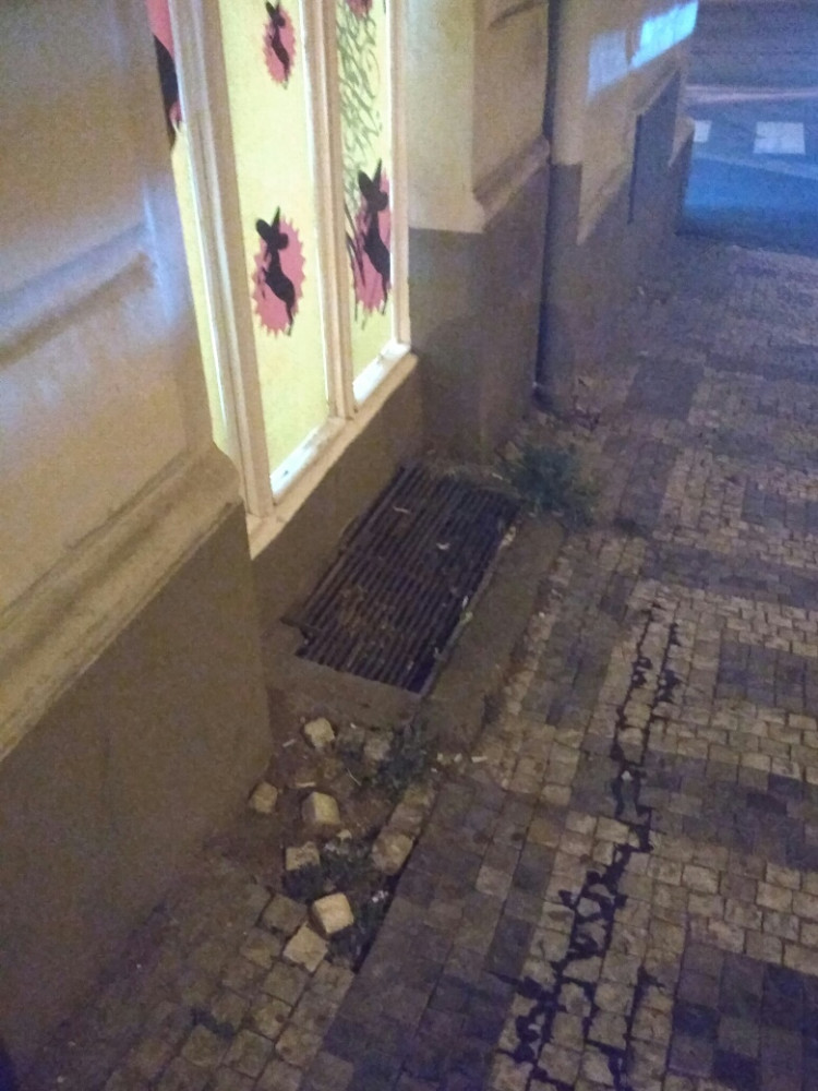 Poškozená dlažba, jejíž poškození se průběžně zvětšuje.