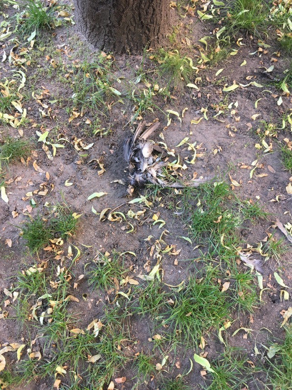 mrtvý pták na hřišti Flora u stromu za pískovištěm
