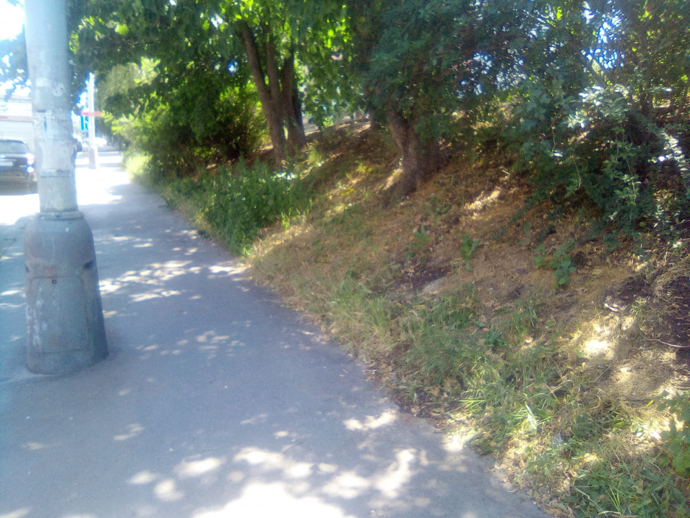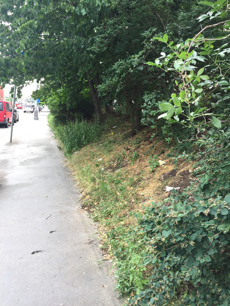 Hezký den, ulice Olšanská za Benzinou a u cizinecké policie, je nepořádek, odpadky mezi zelení.