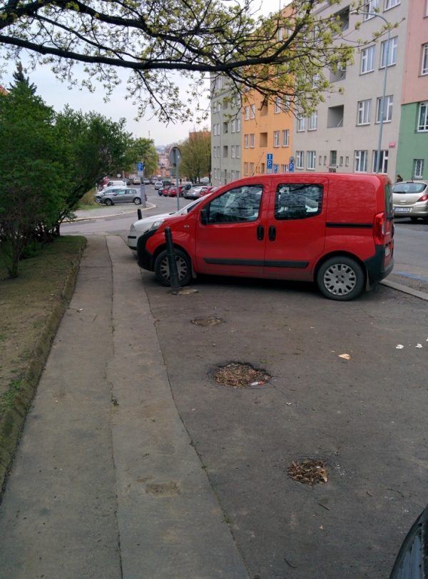 Vyvrácené sloupky na chodníku na Hollarově naštěstí. Auta místa využívají a zbývá pouze málo místa pro chodce.