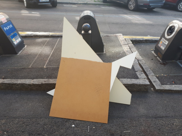 Dřevěné desky odložené u kontejneru na tříděný odpad.