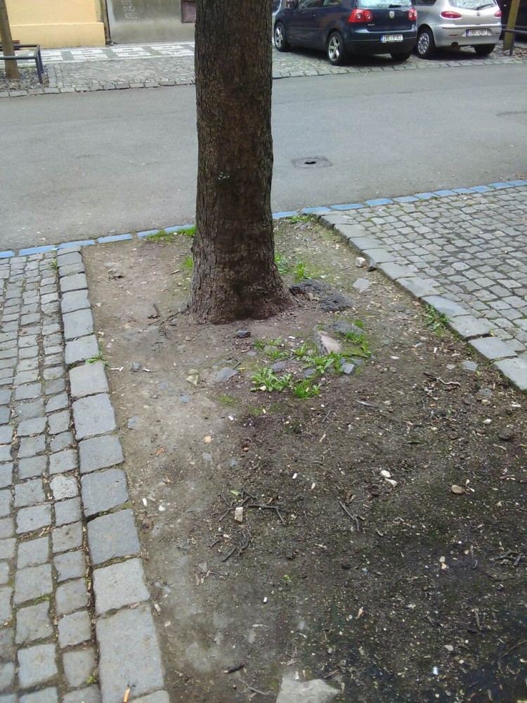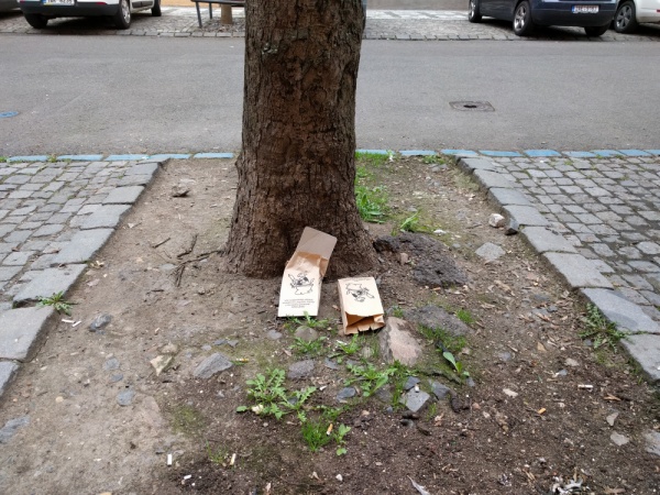 Pod stromom pred domom na ul. Křížkovkského 13 sa nachádzajú naplnené papierové vrecká plné psích extrementov. Tiež (taky) je na obrubníku rozmazaný exkrement.