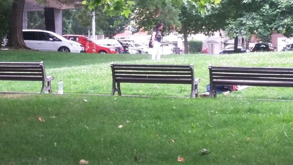 Povalujíci se odpadky a opilec na Churchillove náměstí