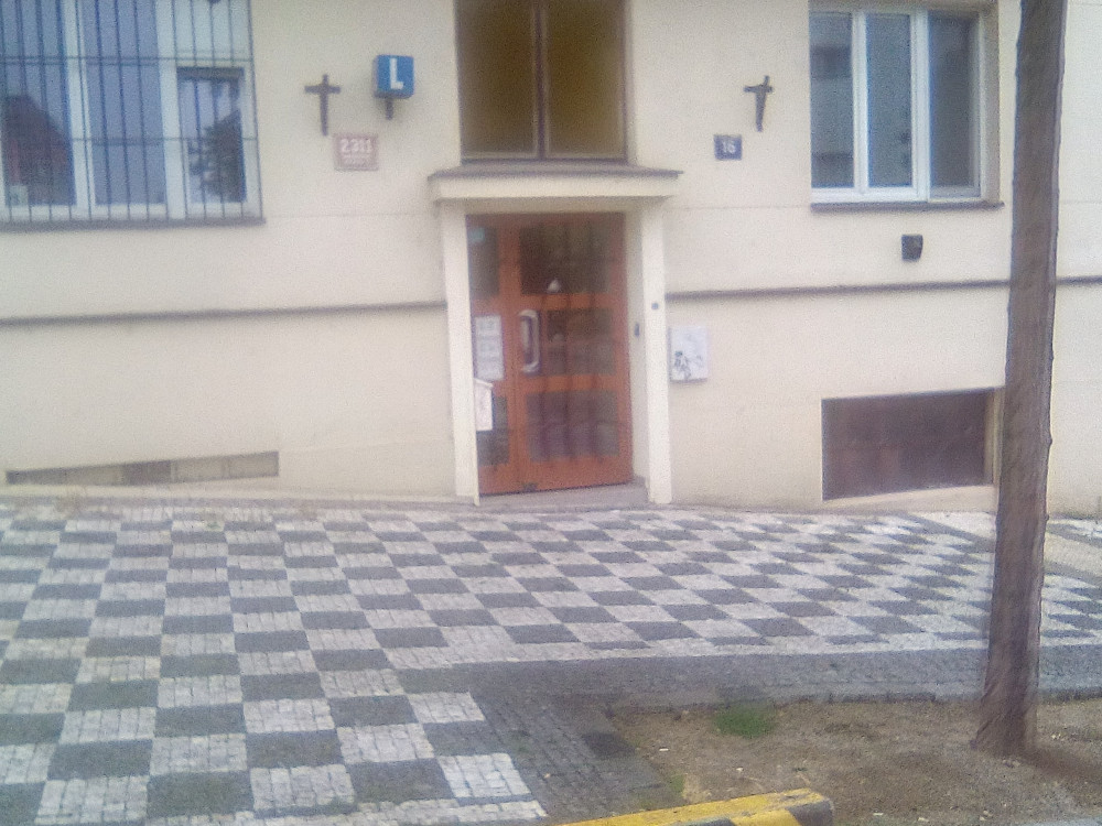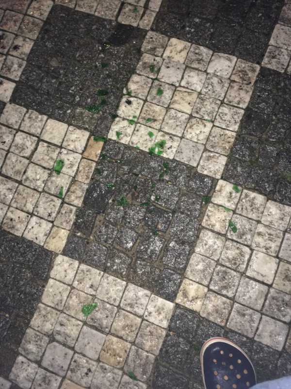 Přímo před vchodem rozbita láhev od piva, všude střepy