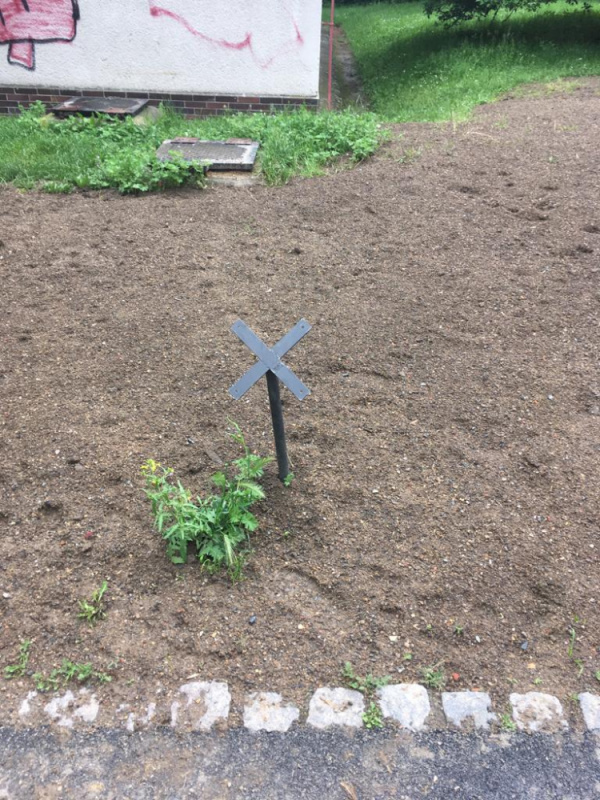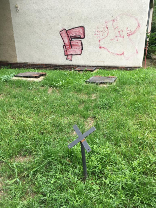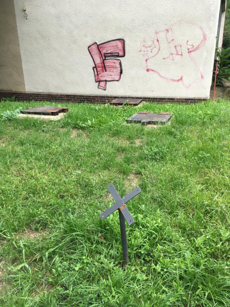 Znicena cedule se zakazem vstupu psu. Cedule je zahozena za plotem regulacni stanice plynu. Bohuzel na pozemku s timto zakazem se ted venci psy, je to vedle detskeho hriste.