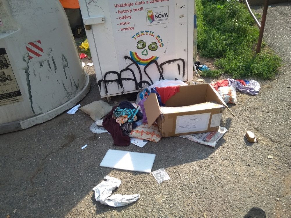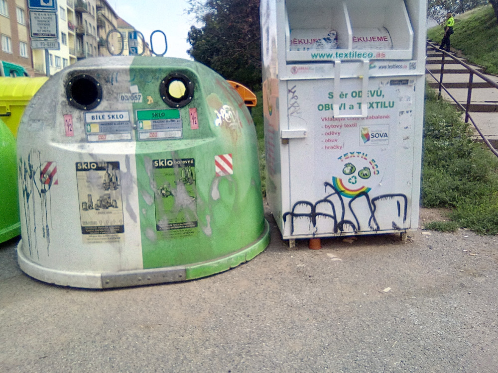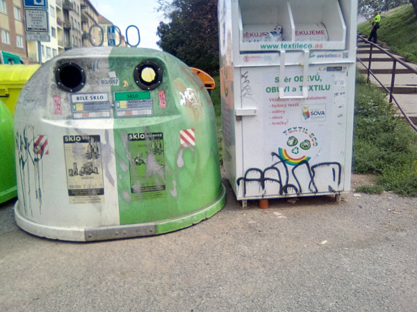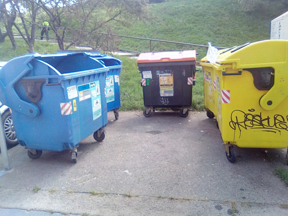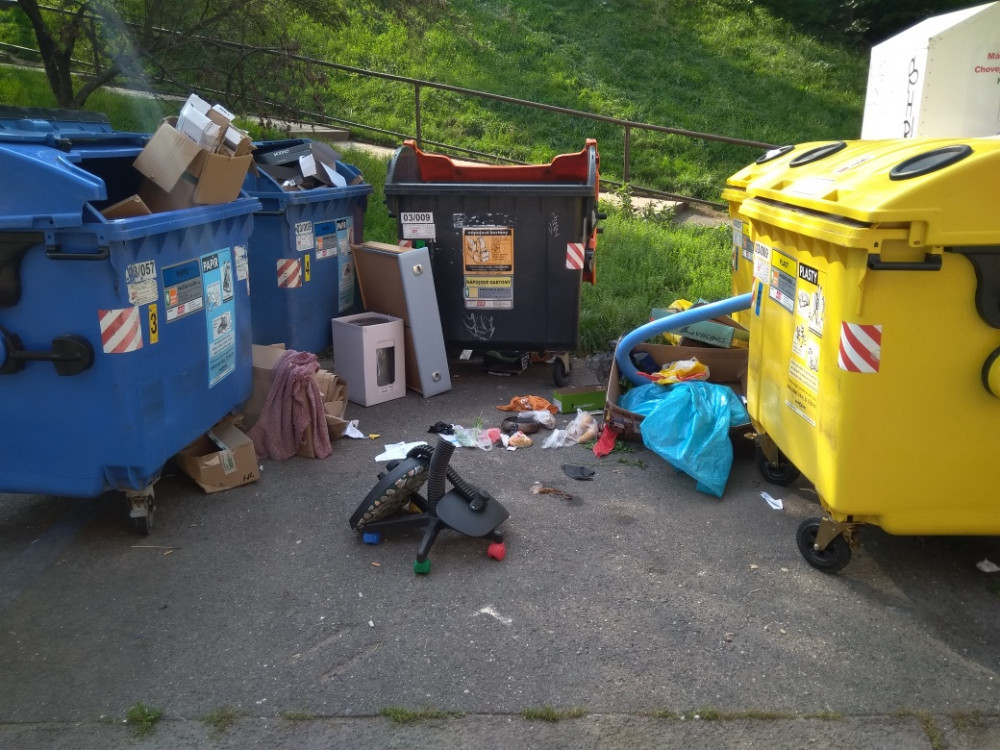 Nepořádek kolem kontejnerů + mezi stojícími vozidly