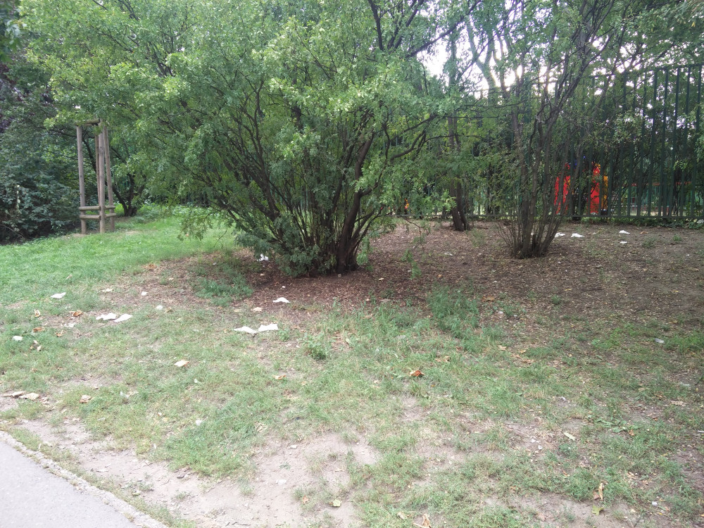 Nepořádek v ulici U vodárny mezi Vinohradskou a dětským hřištěm.