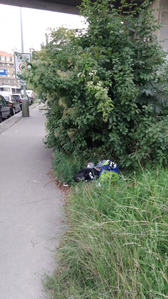 Odpad po bezdomovcích na travnaté ploše. Pod silničním mostem u tramvajové trati je navíc bílá trouba nebo mikrovlnka. Děkuji předem za úklid.