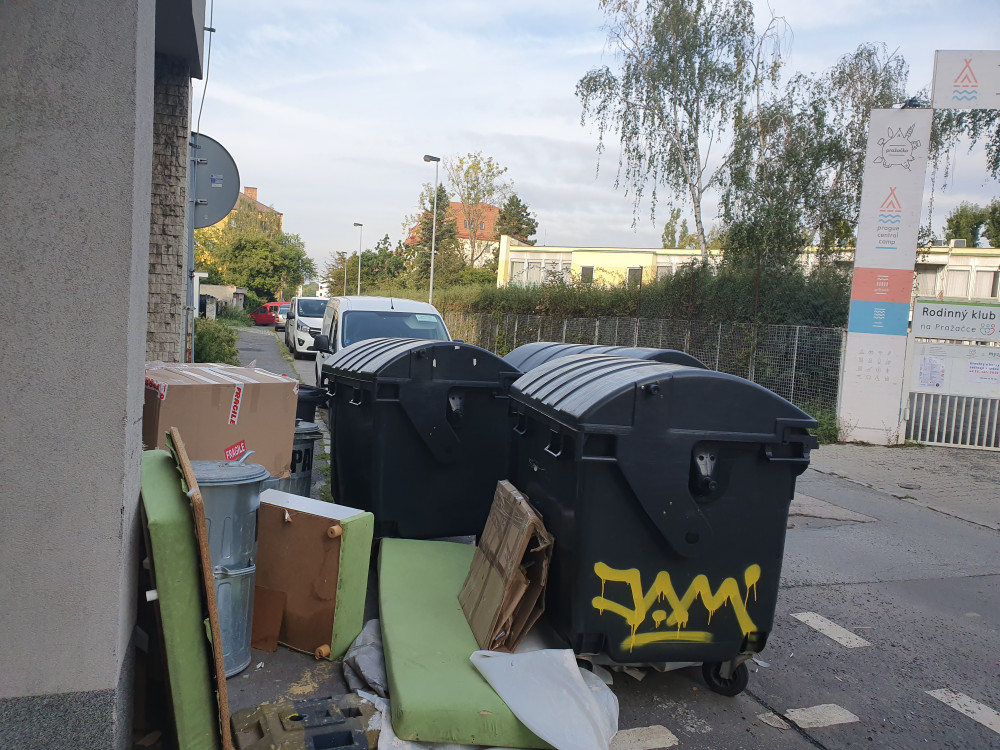 okolo kontejnerů přímo naproti vchodu do kempu Pražačka/Rodinný klub Ulitka je odložená rozebraná postel, křesla, krabice atd. Dále tam někdo přenesl 3 malé , ale plné popelnice, které nikdo neodváží a které tam zřejmě nepatří.