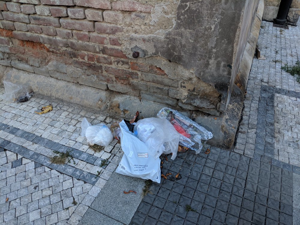Hromada odpadků se valí už tři dny na rohu kostela. Děkuji za uklízení.