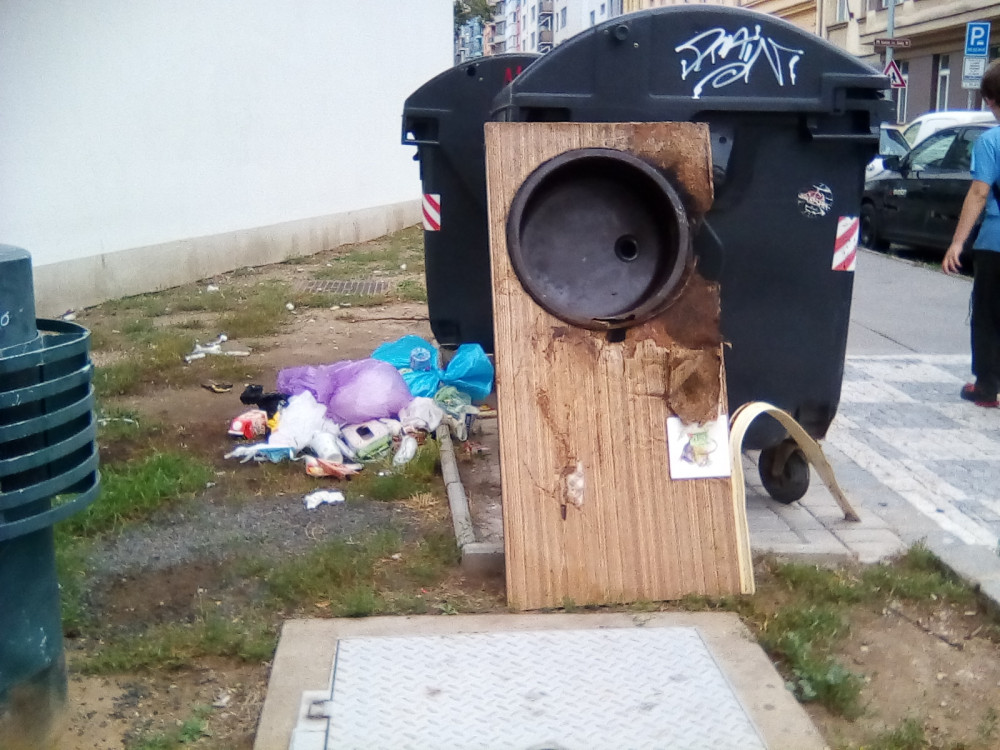 Nepořádek u kontejnerů a pracovní deska s dřezem