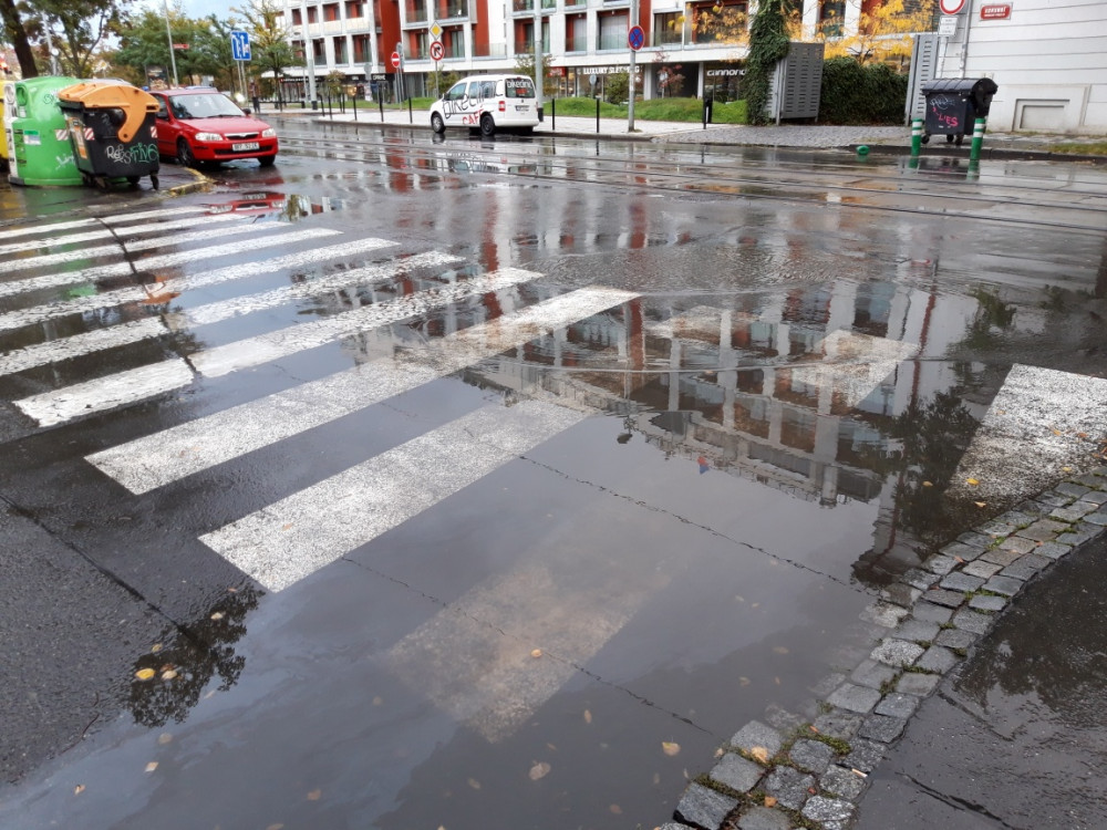 voda stoji porad na prechodu, neda se prejit suchou nohou krizovatka libicka x korunni