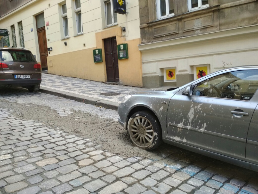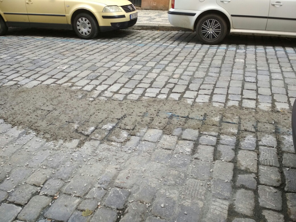 Vyteklý a stále čerstvý beton na nedávno položené dlažbě, který pomalu zasychá. Nutné odstranit co nejdříve.