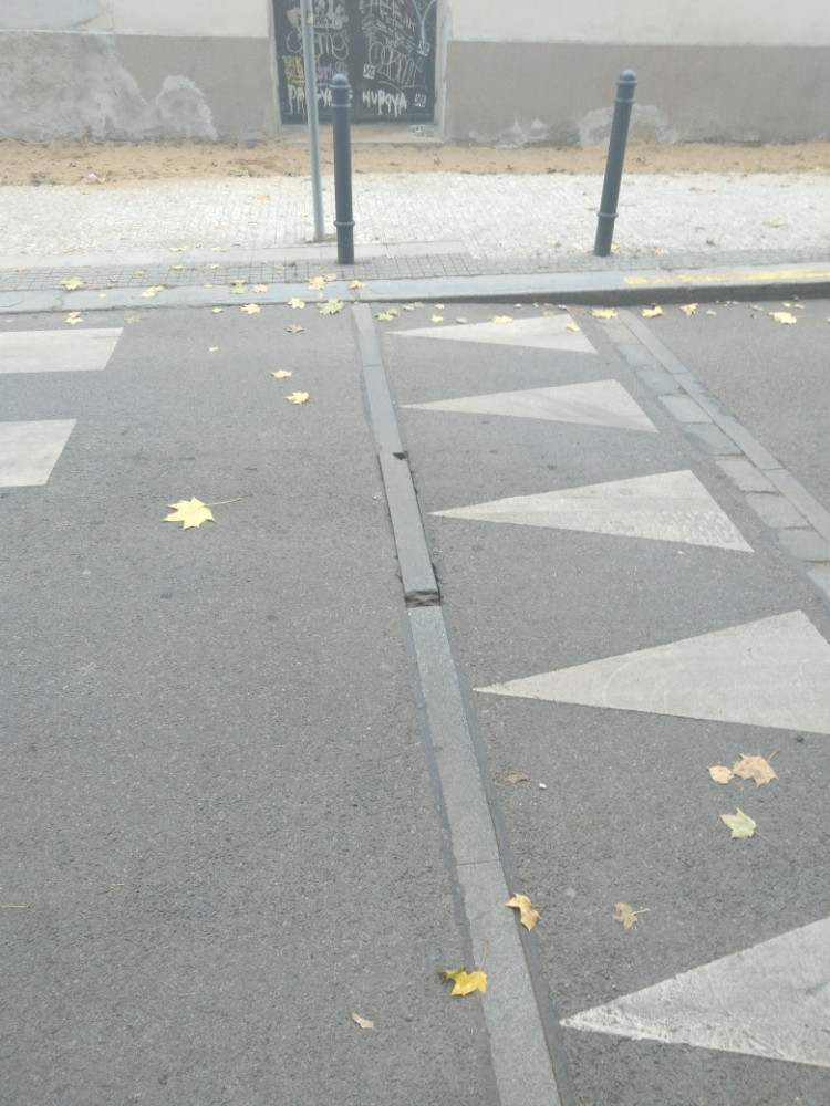 vyčnívající kus žuloveho kamene kamene. na opačné straně taktéž. Na rohu krizovstky Křížkovského a Fibichova u Botasu 66